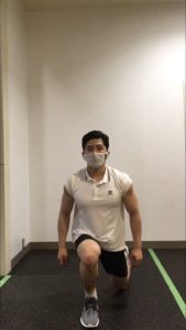 - フロントランジで、前足を踏み込む際は、上体を立てて、後足に体重をかけたまま、着地する。着地してから、バックランジの姿勢を作るイメージでしゃがむ。立ち上がる時は、後ろに重心を戻しつつ、体を起こし、体が起ききる寸前で、床を押して、元の位置に戻る