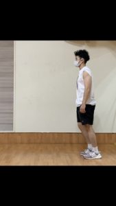 - 下にしゃがんだ際に、前に重心をかけすぎて、前足のかかとが浮かないようにする。